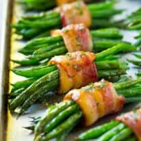 Tender crisp green beans wrapped in bacon and brushed with a simple brown sugar glaze.