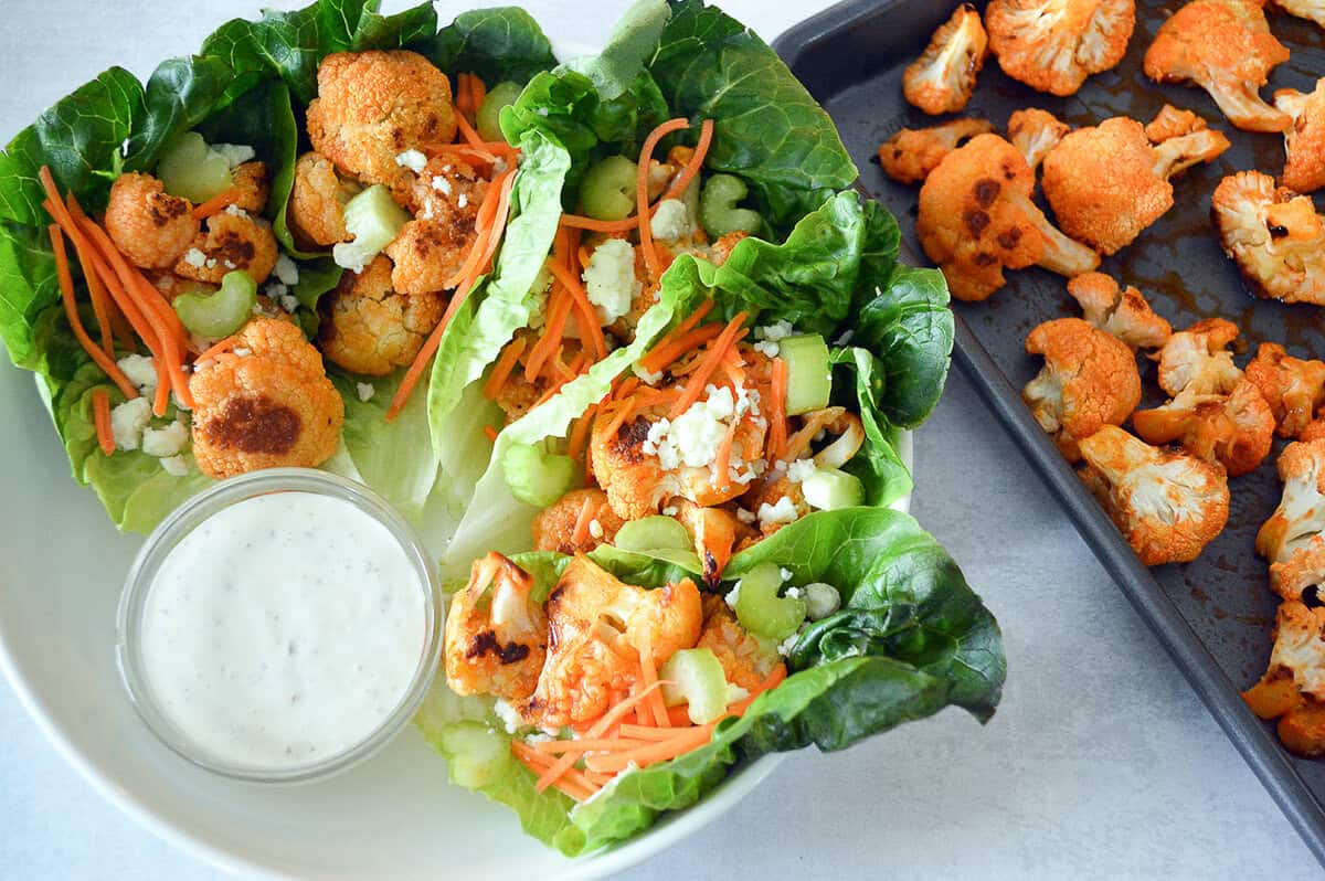 - Fill lettuce cups with buffalo cauliflower and top with carrots, celery and blue cheese.