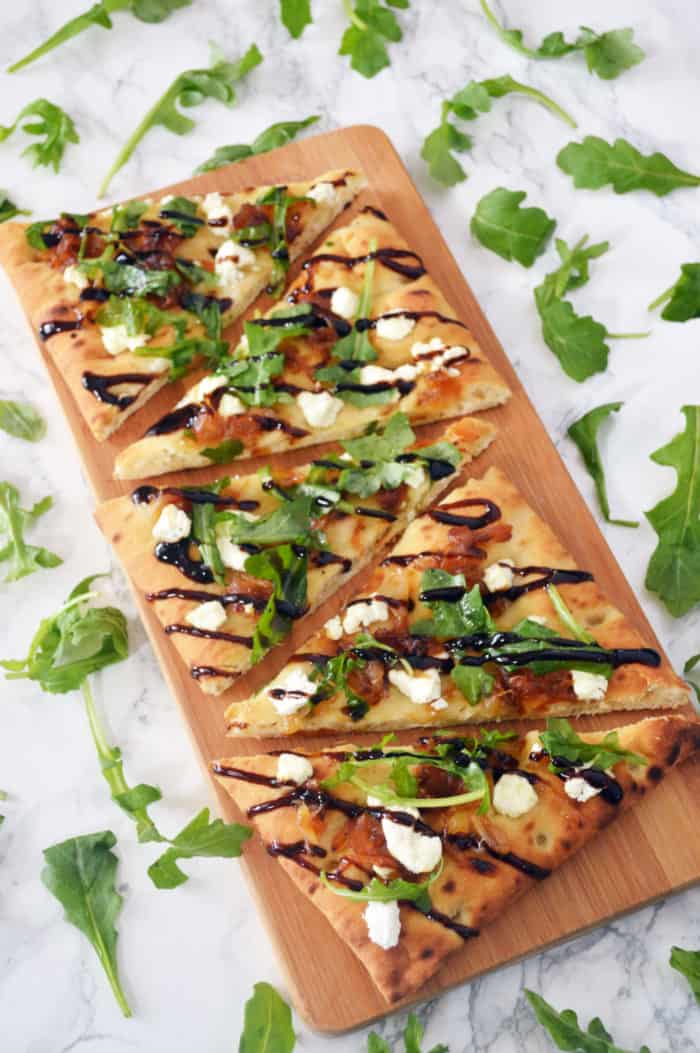 The ingredients are flatbread, caramelized onions, goat cheese, arugula, and balsamic glaze.
