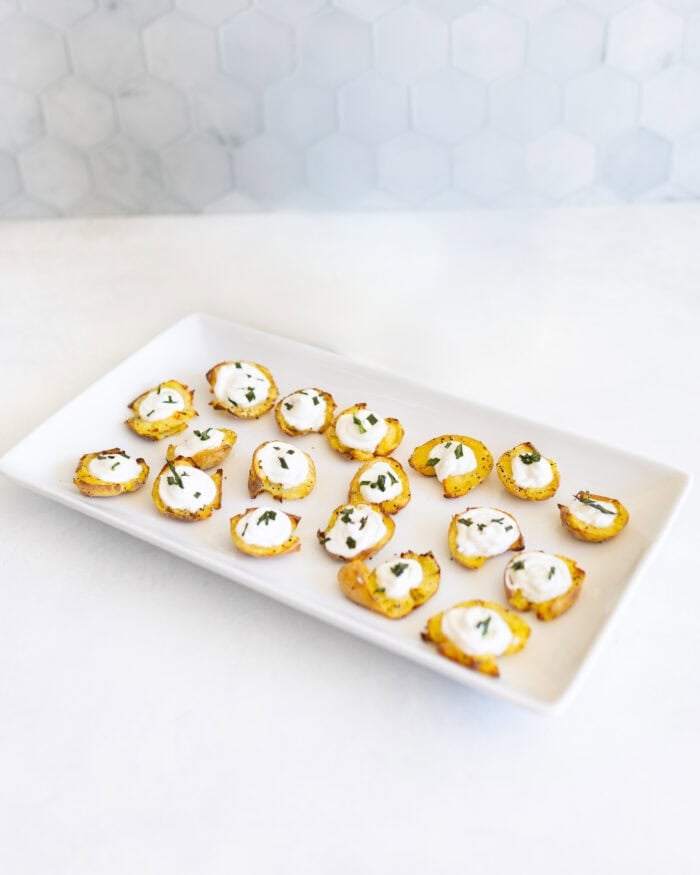 These crispy Smashed Potatoes are a lighter spin on classic potato skins and sure to satisfy French fry cravings. This recipe calls for the potatoes to be microwaved until tender to save time, but the potatoes can also be boiled in water first. Top with Greek yogurt and chives, or switch up with your favorite dressing or dip.